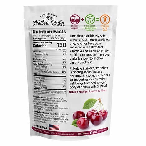 Nature’s Garden Probiotic Tart Cherries - Anh đào chua không chỉ là một món siêu ăn vặt mềm, dai ngon, quả anh đào khô được tăng cường vitamin A chống oxy hóa & 10 tỷ cfu sống đã được chứng minh lâm sàng để cải thiện sức khỏe hệ tiêu hóa và đem lại nhiều giá trị về sức khỏe cũng như sắc đẹp, đặc biệt với chị em phụ nữ.