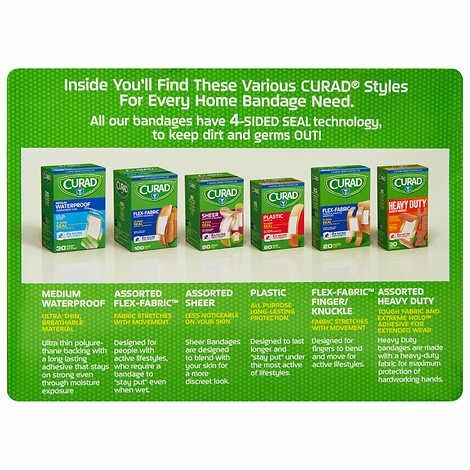 Bên trong, bạn sẽ tìm thấy những phong cách Curad khác nhau. Đối với mọi nhu cầu băng tại nhà. Tất cả các loại băng của Curad đều có công nghệ bịt kín 4 mặt, giúp giữ sạch bụi bẩn và vi trùng! Chống thấm nước vừa, Chất liệu siêu mỏng, thoáng khí; Lớp nền polyurethane siêu mỏng với chất kết dính lâu dài, bền chắc ngay cả khi tiếp xúc với độ ẩm. Các loại vải Flex, vải co giãn theo chuyển động; được thiết kế cho những người có lối sống năng động, những người cần băng để "giữ yên" Ngay cả khi bị ướt. Các loại tuyệt đối, ít gây chú ý trên da của bạn; băng tuyệt đối được thiết kế để hòa hợp với làn da của bạn để trông kín đáo hơn. Các loại chịu tải nặng / nhựa, bảo vệ lâu dài cho mọi mục đích; được thiết kế để tồn tại lâu hơn và 'ở lại' Theo phong cách sống năng động nhất; vải dai và chất kết dính cực kỳ giữ lâu để mặc lâu; băng nặng được làm bằng vải chịu lực để bảo vệ tối đa cho đôi tay chăm chỉ. Ngón tay vải uốn cong / Knuckle, vải co giãn theo chuyển động; được thiết kế để ngón tay uốn cong và di chuyển cho lối sống năng động.