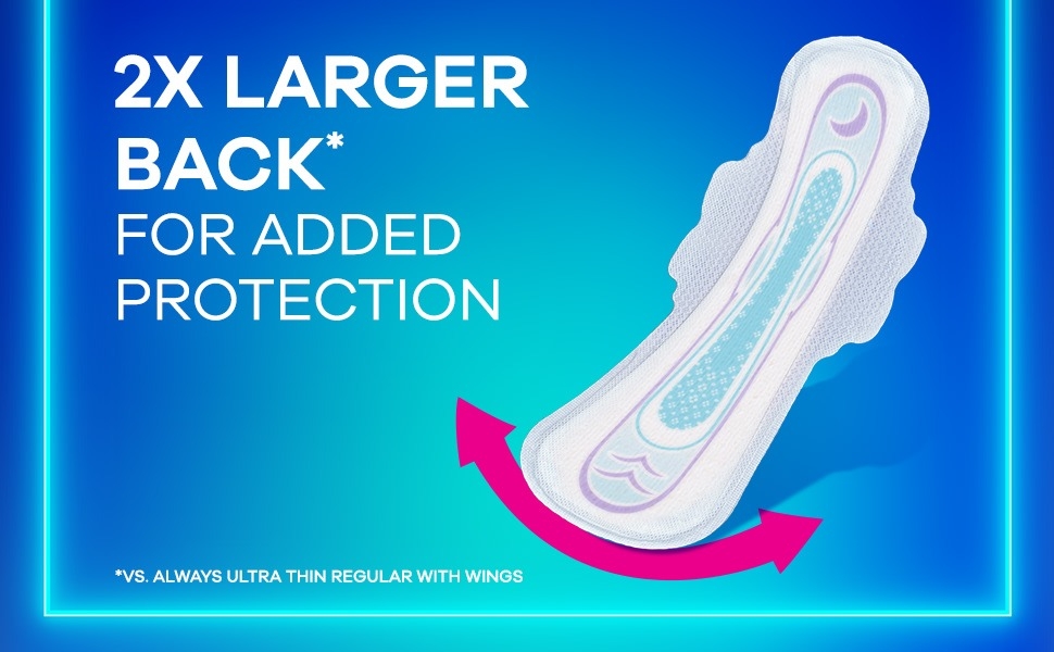 Always Ultra Thin Advanced Overnight Pads hoàn toàn được sáng tạo để có được sự thoải mái không bị rò rỉ lên đến 100% nhờ Hệ thống bảo vệ 4X và tấm lưng 2 lớn hơn gấp 2 lần để giúp ngăn rò rỉ vào ban đêm. Loại bỏ nước chảy trong vài giây, khóa các lỗ rò rỉ để bảo vệ lâu dài và trung hòa mùi hôi, để bạn có thể luôn thơm tho và sạch sẽ suốt đêm. Cho dù bạn ngủ thế nào vẫn cung cấp cho bạn sự bảo vệ vững chắc trong thời kỳ kinh nguyệt.(C)*
