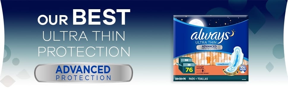 Always Ultra Thin Advanced Protection Overnight với công nghệ CoreBoost thấm hút thêm 15% chất lỏng và giúp lớp trên cùng luôn khô ráo. Những loại băng vệ sinh tuyệt vời này mang lại cho bạn cảm giác khô ráo và sạch sẽ lâu dài trong đêm