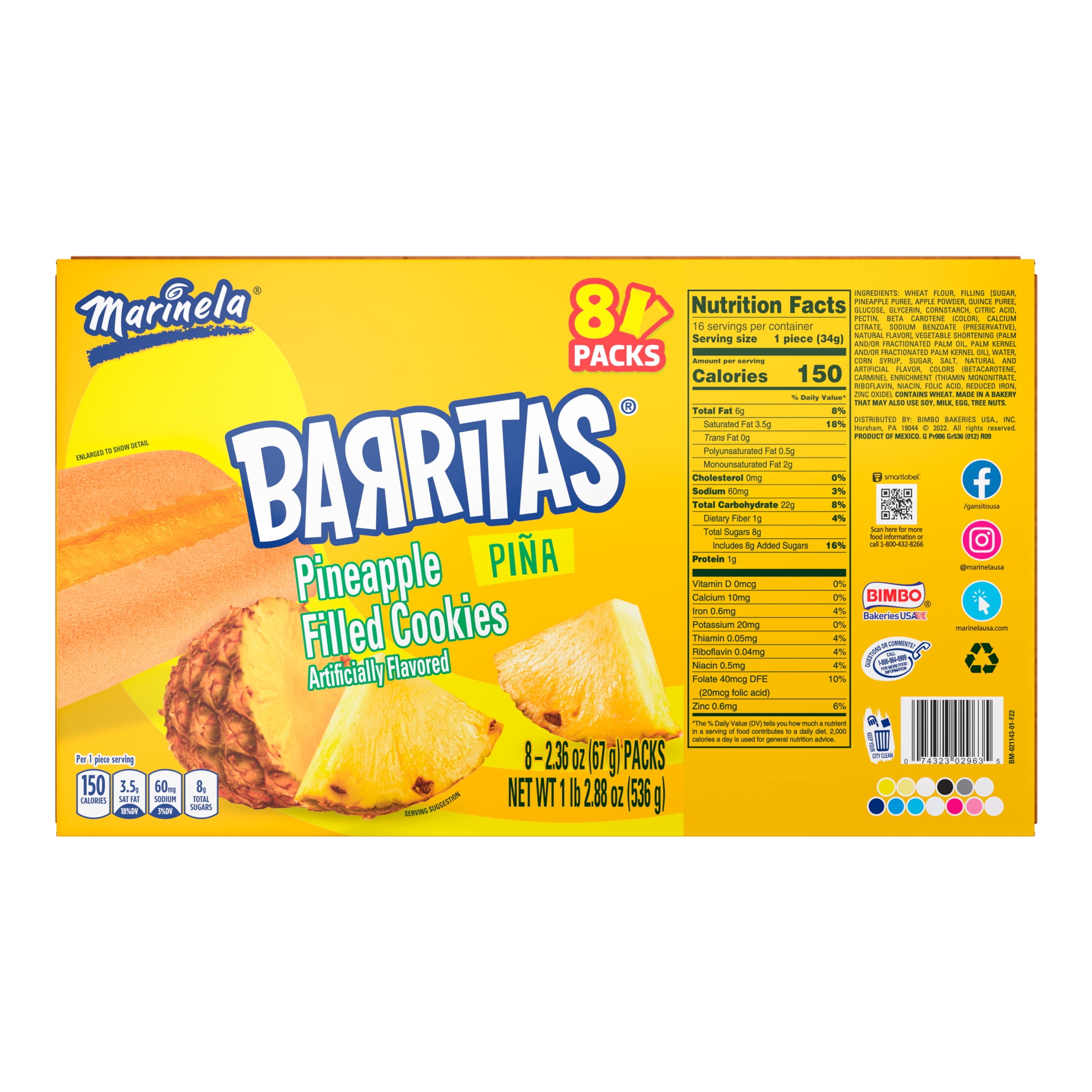 Marinela Barritas Piña Filled Cookies - Bánh quy nhân dứa Marinela Barritas là loại bánh quy ngọt với lớp vỏ ngoài mềm và một lớp nhân dứa thơm ngon bên trong. Nhân dứa có vị chua ngọt, mang lại cảm giác tươi mát và dễ chịu khi ăn. Vỏ bánh có độ mềm mại, hơi dai, không quá giòn, giúp cân bằng với vị ngọt của nhân dứa. Marinela Barritas được đóng gói riêng lẻ, tiện lợi để mang theo và thưởng thức như một món ăn nhẹ hoặc tráng miệng.(W)