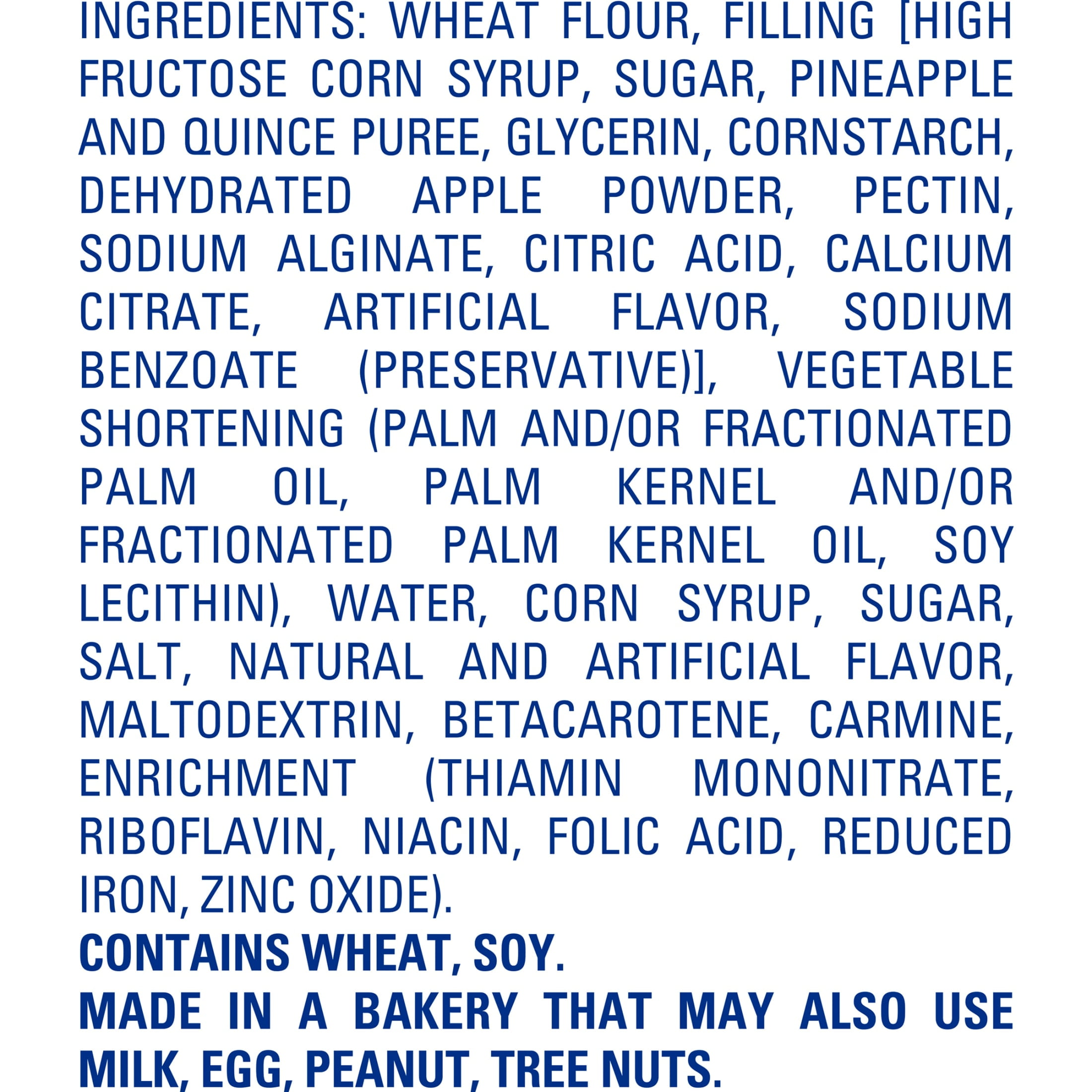 Thành phần: Bột mì, nhân [đường, sốt dứa, bột táo, sốt mộc qua, glucose, glycerin, bột ngô, axit xitric, pectin, beta carotene (màu), canxi citrate, natri benzoate (chất bảo quản), hương vị tự nhiên], chất béo thực vật [dầu cọ, dầu cọ phân đoạn, dầu hạt cọ, dầu hạt cọ phân đoạn], nước, xi-rô ngô, đường, muối, hương vị tự nhiên và nhân tạo, màu sắc [beta carotene, carmine], chất làm giàu [thiamin mononitrate, riboflavin, niacin, axit folic, sắt khử, kẽm oxit].