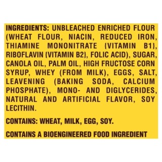 Bột mì chưa tẩy trắng, giàu dinh dưỡng (Bột mì, Niacin, Sắt khử, Thiamine Mononitrate {Vitamin B1}, Riboflavin {Vitamin B2}, Axit Folic), Đường, Dầu hạt cải, Dầu cọ, Siro ngô hàm lượng fructose cao, Whey (từ sữa), Trứng, Muối, Chất tạo xốp (Baking soda, Canxi photphat), Monoglyceride và Diglyceride, Hương liệu nhân tạo và tự nhiên, Lecithin đậu nành.