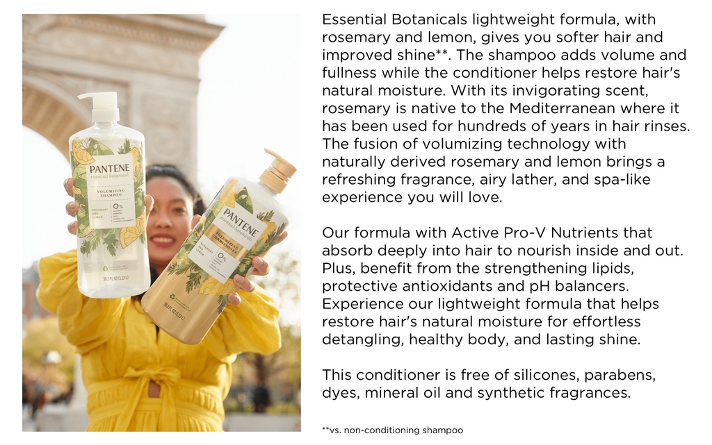 Pantene Essential Botanicals Rosemary and Lemon Volumizing Shampoo & Conditioner với công thức Essential Botanicals mang đến cho bạn mái tóc mềm mại và độ bóng mượt, giúp phục hồi độ ẩm tự nhiên của tóc. Kết hợp giữa công nghệ tạo bọt với hương thảo và chanh mang đến hương thơm sảng khoái.