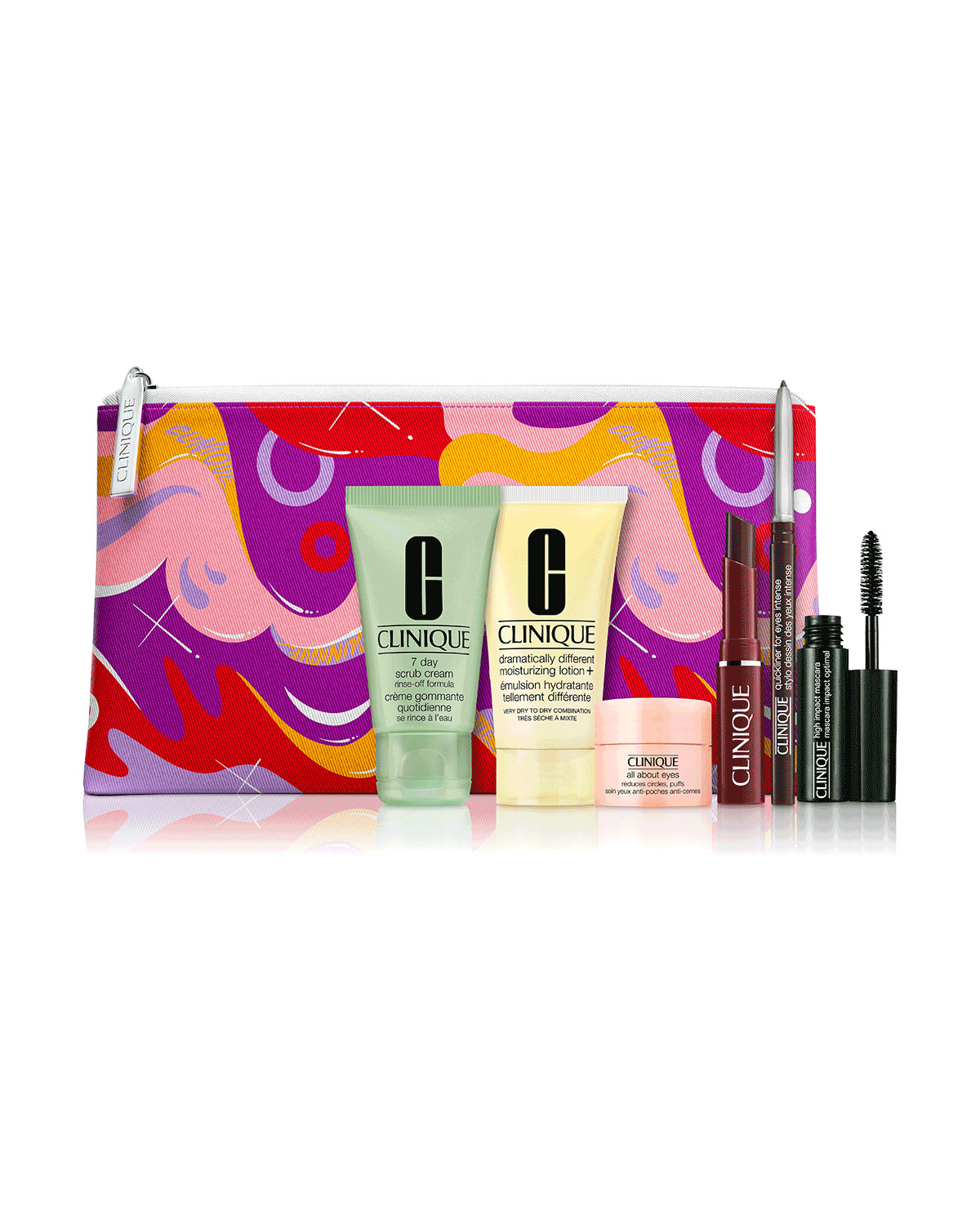 Clinique Black Honey & Friends 7 Piece Kit - Bộ 7 món trang điểm mini chứa 6 mẫu sang trọng, bao gồm chì kẻ mắt, mascara, kem dưỡng mắt, kem tẩy tế bào chết, kem dưỡng ẩm và cả cây son gần như mang tính biểu tượng trong Mật ong đen (Black honey) với kích thước hoàn hảo phù hợp khi di chuyển và một túi trang điểm độc quyền của nhà Clinique.