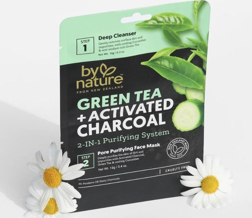 Nature From New Zealand Green Tea, Activated Charcoal 2-in-1 Wash off Face Mask - Bộ mặt nạ hai bước By Nature là giải pháp hoàn hảo để làm sạch sâu và thanh lọc làn da của bạn. Sự kết hợp làm mát của dưa chuột và chiết xuất trà xanh giúp làm dịu làn da, trong khi than hoạt tính có tác dụng hấp thụ các tạp chất và khiến lỗ chân lông của bạn được sạch sâu và thông thoáng mà không làm cho làn da bị khô hay bong tróc.(W)