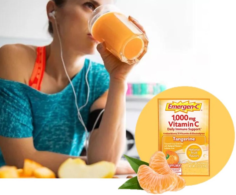 Emergen-C cung cấp hỗ trợ cho hệ thống miễn dịch của bạn và bổ sung thêm vitamin C dưới dạng bột uống ngọt và sảng khoái. Uống hỗn hợp này cung cấp một lượng lớn vitamin C giúp tăng cường hệ thống miễn dịch và giúp bạn cảm thấy tràn đầy năng lượng. Mỗi gói Emergen-C chứa 1000mg vitamin C, tương đương với 10 quả cam, đồng thời nó cũng giàu vitamin B và chất chống oxy hóa để tăng cường miễn dịch. Emergen-C cũng bổ sung các chất điện giải có xu hướng bị mất khi bạn tập luyện hàng ngày hoặc đang bị cảm lạnh, từ đó giúp hỗ trợ các mục tiêu chăm sóc sức khỏe hàng ngày của bạn và giúp bạn cảm thấy tốt hơn.