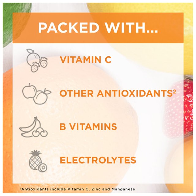 Chứa nhiều vitamin C hơn 10 quả cam, bột hỗn hợp nước uống Emergen-C Immune+ được cung cấp nhiều chất dinh dưỡng giúp bạn cảm thấy dễ chịu. Kết quả dựa trên việc sử dụng giá trị cơ sở dữ liệu dinh dưỡng của USDA.gov cho một quả cam tươi, lớn.