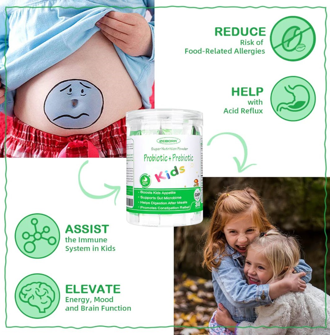 Zebora kids probiotic & prebiotics powder - Một loại thực phẩm bổ sung không có hương vị chứa nhiều chủng lợi khuẩn và chất xơ prebiotic, bổ sung men vi sinh dành cho trẻ từ 3 tuổi trở lên, không biến đổi gen, ngon miệng, thân thiện với trẻ em - với 8 chủng men vi sinh và 5 tỷ CFU, kết hợp với prebiotic được lựa chọn thủ công. Zebora Kids Probiotics được bào chế đặc biệt để giúp thúc đẩy sức khỏe đường ruột, sự thèm ăn, tiêu hóa và hệ miễn dịch của trẻ em.(A)