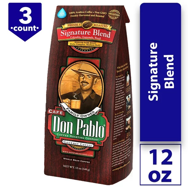 Don Pablo Signature Blend Gourmet Coffee - Sự caramen hóa nhẹ của đường tự nhiên trong hạt cà phê mang đến cho loại cà phê Medium-Dark này một cảm giác rang xay, trong khi nó vẫn giữ được đặc tính hương vị tự nhiên, tạo cho nó một dư vị ngọt ngào, dễ chịu. Cà phê nguyên hạt Arabica 100%, không chứa GMO. Đi kèm trong một túi có thể kéo lại tiện dụng.
