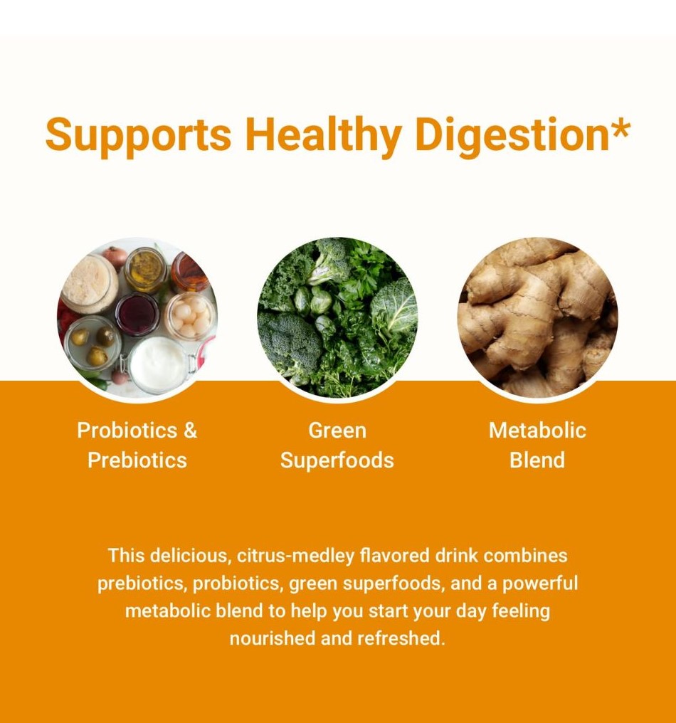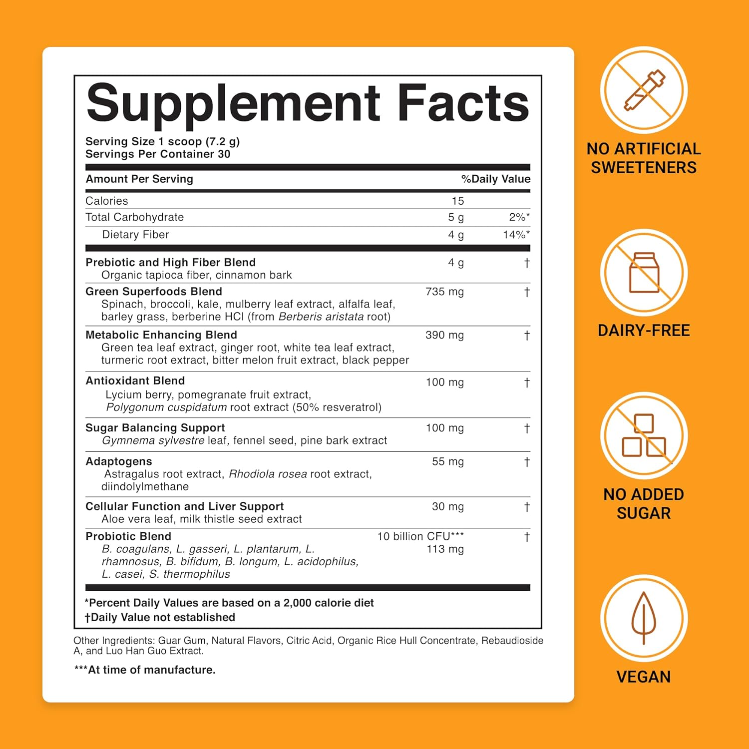 Thành phần: Fructooligosaccharides rễ rau diếp xoăn, vỏ quế, rau bina, bông cải xanh, cải xoăn, chiết xuất lá dâu tằm, lá cỏ linh lăng, cỏ lúa mạch, berberine HCI, chiết xuất lá trà xanh, rễ gừng, chiết xuất lá trà trắng, chiết xuất rễ nghệ, chiết xuất quả mướp đắng, quả tiêu đen, quả Lycium, chiết xuất quả promegranate, chiết xuất rễ Polygonum cuspidatum (50% resveratrol), lá Gymnema sylvestre, hạt thì là, chiết xuất vỏ thông, chiết xuất rễ Hoàng kỳ, chiết xuất rễ Rhodiola rosea, DIM (diindolylmethane), lá lô hội hữu cơ, chiết xuất hạt kế sữa, B. coagulans, L. gasseri, L. plantarum, L. rhamnosus, B. bifidum, B. longum, L. acidophilus, L. casei, S. thermophilus, hương vị tự nhiên, guar gum, axit citric, cô đặc vỏ trấu, chiết xuất quả la hán.