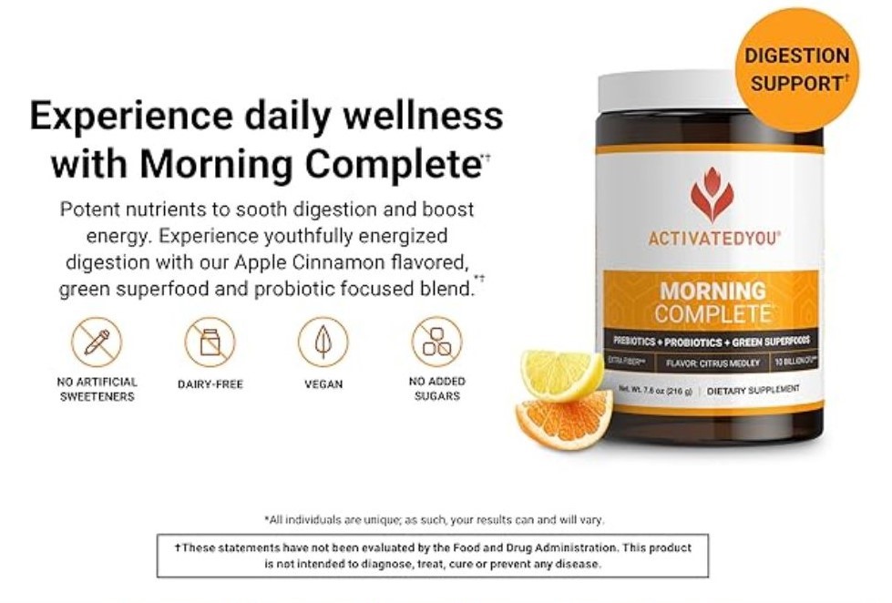 Activatedyou Morning Complete Superfood for Heath - Thực phẩm bổ sung giàu dinh dưỡng hàng ngày được lựa chọn riêng, được thiết kế để hỗ trợ chức năng tiêu hóa bình thường, mức năng lượng hàng ngày và sức khỏe tổng thể. Thức uống thơm ngon có hương cam quýt này hoàn hảo cho bất kỳ ai muốn bắt đầu mỗi ngày một cách lành mạnh và tận hưởng sức khỏe tối ưu trong suốt cuộc đời, nhờ vào hỗn hợp các chất dinh dưỡng mạnh mẽ có trong mỗi ly.