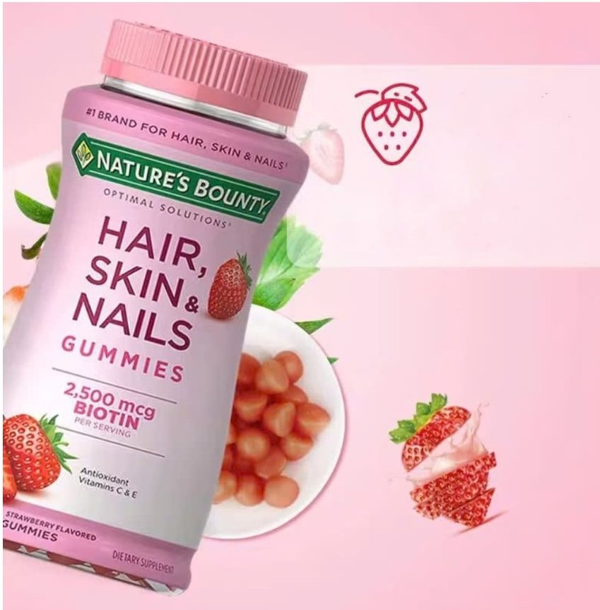 Nature’s Bounty Hair Skin & Nails Gummies - Kẹo dẻo đẹp da, móng & tóc cung cấp các chất dinh dưỡng quan trọng mà cơ thể bạn cần để hỗ trợ vẻ đẹp tự nhiên từ bên trong. Vitamin E và Vitamin C là chất chống oxy hóa. Vitamin E đóng góp cho sức khỏe của da, và Vitamin C tham gia vào quá trình sản xuất và hình thành collagen, tạo thành nền tảng cho làn da tràn đầy sức sống. Biotin giúp duy trì mái tóc khỏe mạnh.(W)