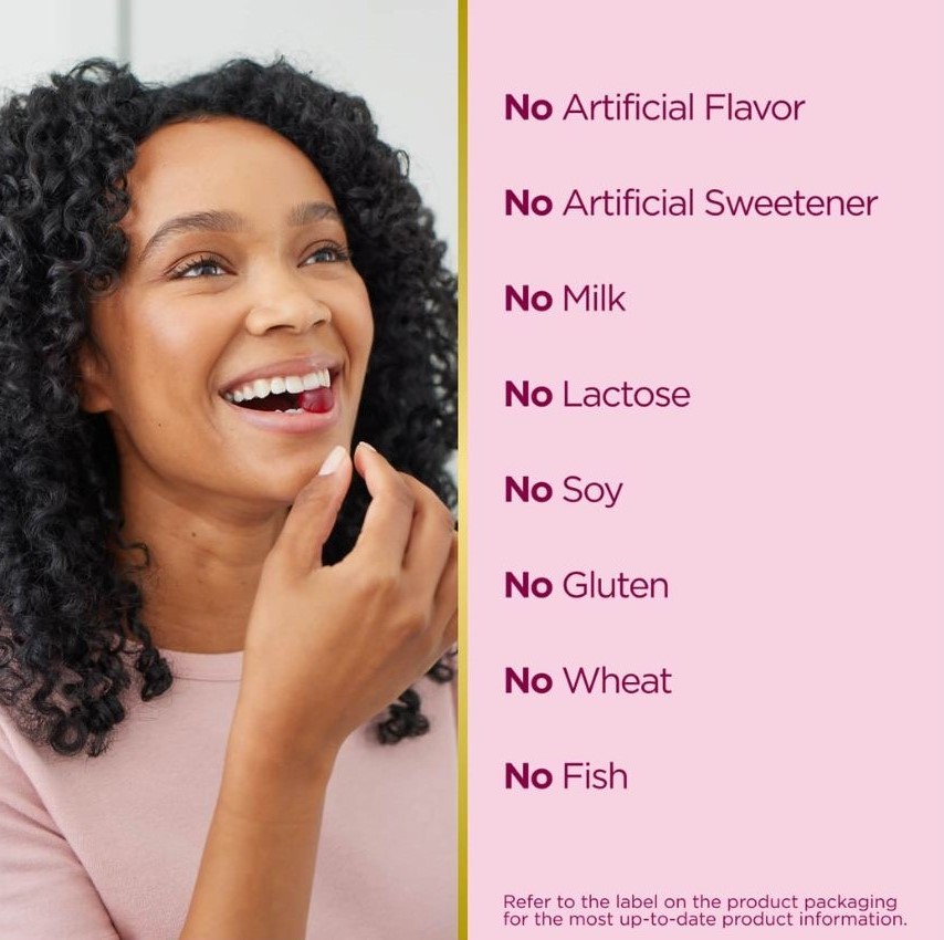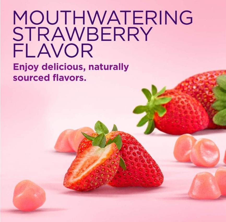 Thành phần: Thành phần khác: Đường mía, Xi-rô glucose, Dicalcium phosphate, Gelatin. Chứa <2%: Axit xitric, Axit lactic, Maltodextrin, Hương vị tự nhiên, Pectin, Silica, Nước ép rau (màu), Dầu thực vật (cọ) (Chứa sáp Carnauba). Vitamin C.