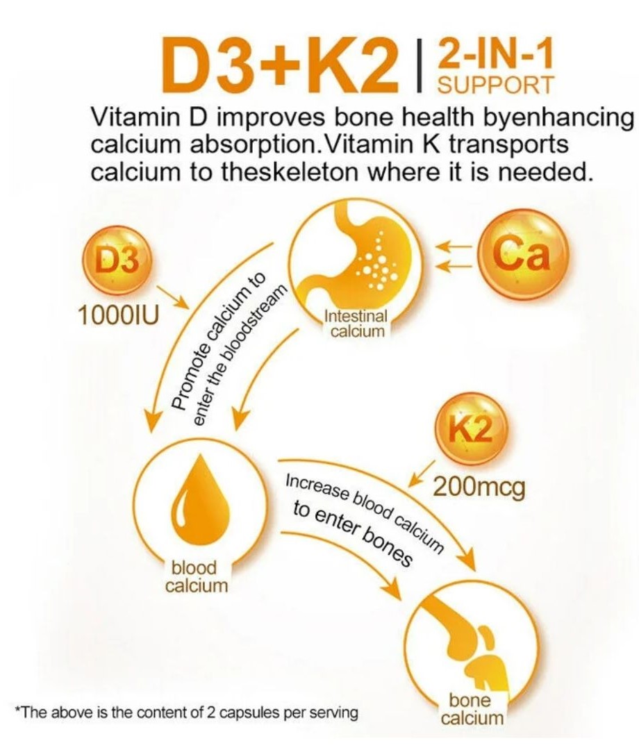 Youtheory K2D3 cung cấp các chất dinh dưỡng thiết yếu giúp cơ thể sử dụng canxi một cách hợp lý cho nhiều chức năng trong quá trình trao đổi chất bình thường." Vitamin K có vai trò rõ ràng trong việc thúc đẩy quá trình khoáng hóa xương bình thường và chức năng tim mạch. Vitamin D có trách nhiệm đảm bảo hấp thụ và giữ lại canxi.