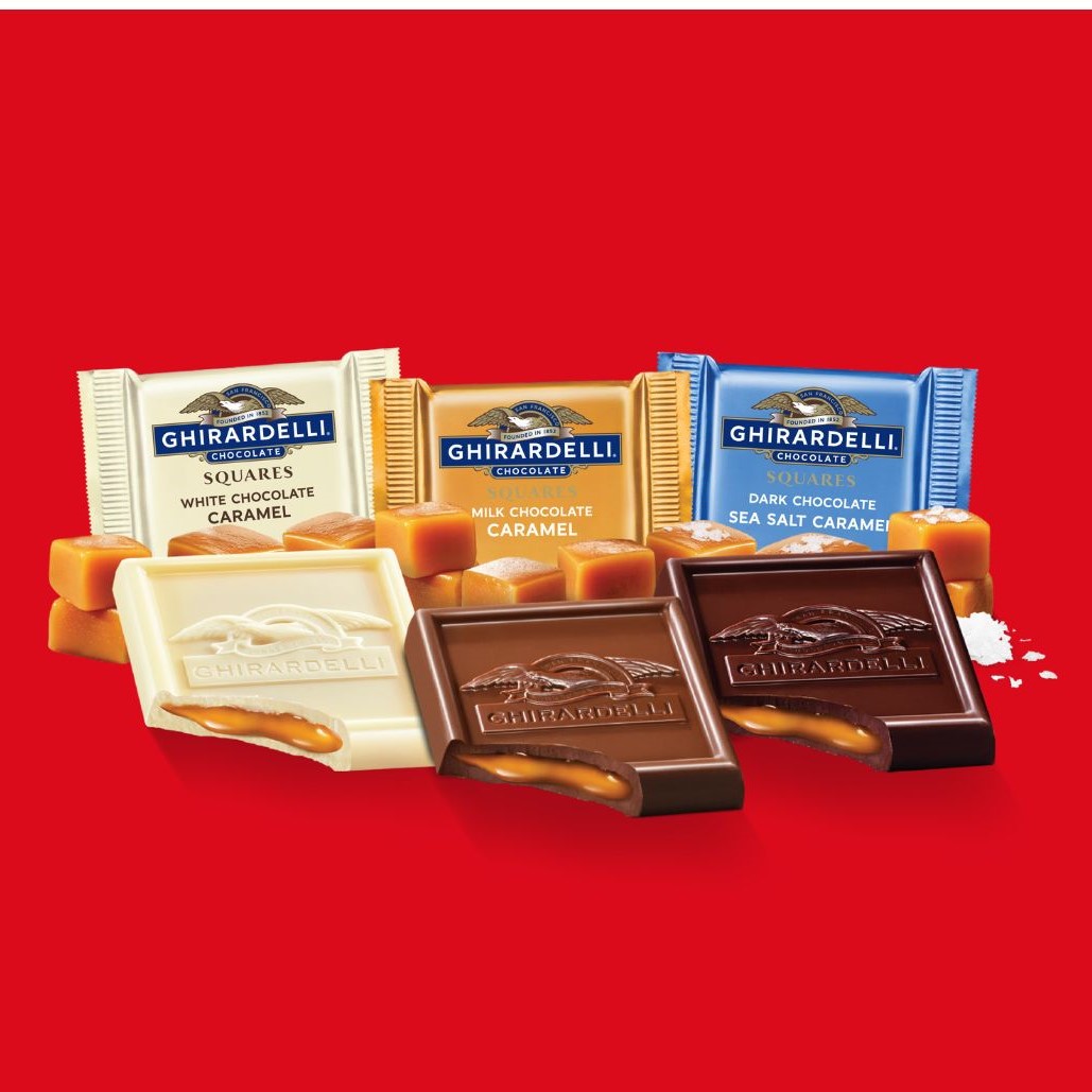Thưởng thức sô cô la Ghirardelli cao cấp với nhân caramel hấp dẫn bất cứ lúc nào - ở nhà, tại nơi làm việc hoặc khi đang di chuyển! Có sẵn trong sô cô la sữa hấp dẫn, sô cô la đen tan chảy chậm hoặc sô cô la trắng kem.