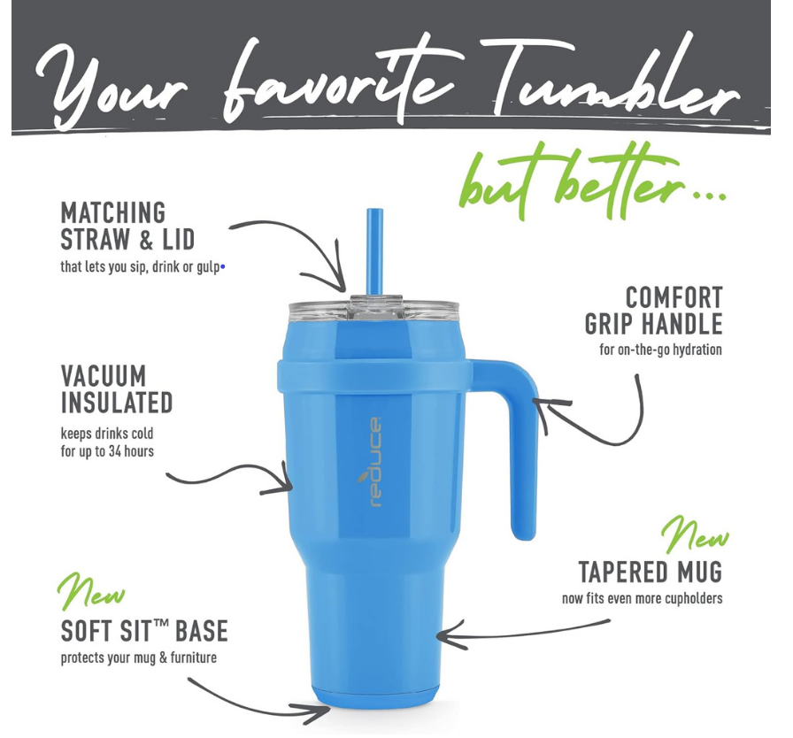 Reduce 40 oz Tumbler with Handle - Chiếc ly cách nhiệt Reduce là sự lựa chọn hoàn hảo cho những ai có lịch trình bận rộn, nó giúp giữ lạnh đồ uống cả ngày cho dù bạn ở nhà hay văn phòng. Ly cách nhiệt này dễ dàng làm sạch và an toàn với máy rửa chén có nghĩa là bạn dành ít thời gian hơn cho việc vệ sinh và dành nhiều thời gian hơn cho những việc quan trọng. Với thiết kế nắp Slip-It-Your-Way, bạn có thể thoải mái lựa chọn giữa việc nhấm nháp ngẫu nhiên, uống đồ uống hoặc uống nước để bổ sung nước!(A)