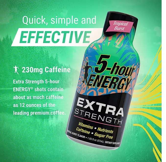 5-Hour Energy Shot, Extra Strength, Tropical Burst - là nguồn năng lượng hoàn hảo cho những người cực kỳ bận rộn, cực kỳ chăm chỉ. Sự kết hợp của vitamin, chất dinh dưỡng và caffein (tương đương với 12 ounce cà phê cao cấp hàng đầu) sẽ giúp bạn cảm thấy tỉnh táo và tràn đầy năng lượng trong nhiều giờ. Tuy nhiên, không giống như nước tăng lực đóng hộp, chỉ mất vài giây để uống, giúp những người cực kỳ bận rộn có được sự tăng cường nhanh chóng, tiện lợi mà họ khao khát.