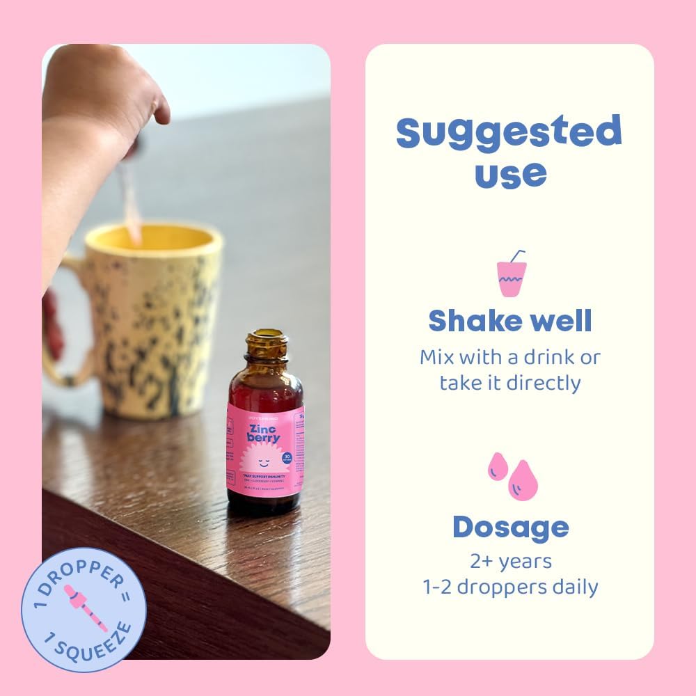 JoySpring ZincBerry - Kids Zinc & Vitamin Supplement - Thực phẩm bổ sung kẽm dạng lỏng lý tưởng cho trẻ em, kết hợp sức mạnh của Kẽm, chiết xuất Elderberry tự nhiên và Vitamin C để hỗ trợ sức khỏe miễn dịch và sức khỏe tổng thể của con bạn. Những giọt hấp thụ nhanh này hoàn hảo cho trẻ mới biết đi và trẻ em từ 2 tuổi trở lên, cung cấp các chất dinh dưỡng thiết yếu với hương vị elderberry không đường thơm ngon mà trẻ em yêu thích.(A)