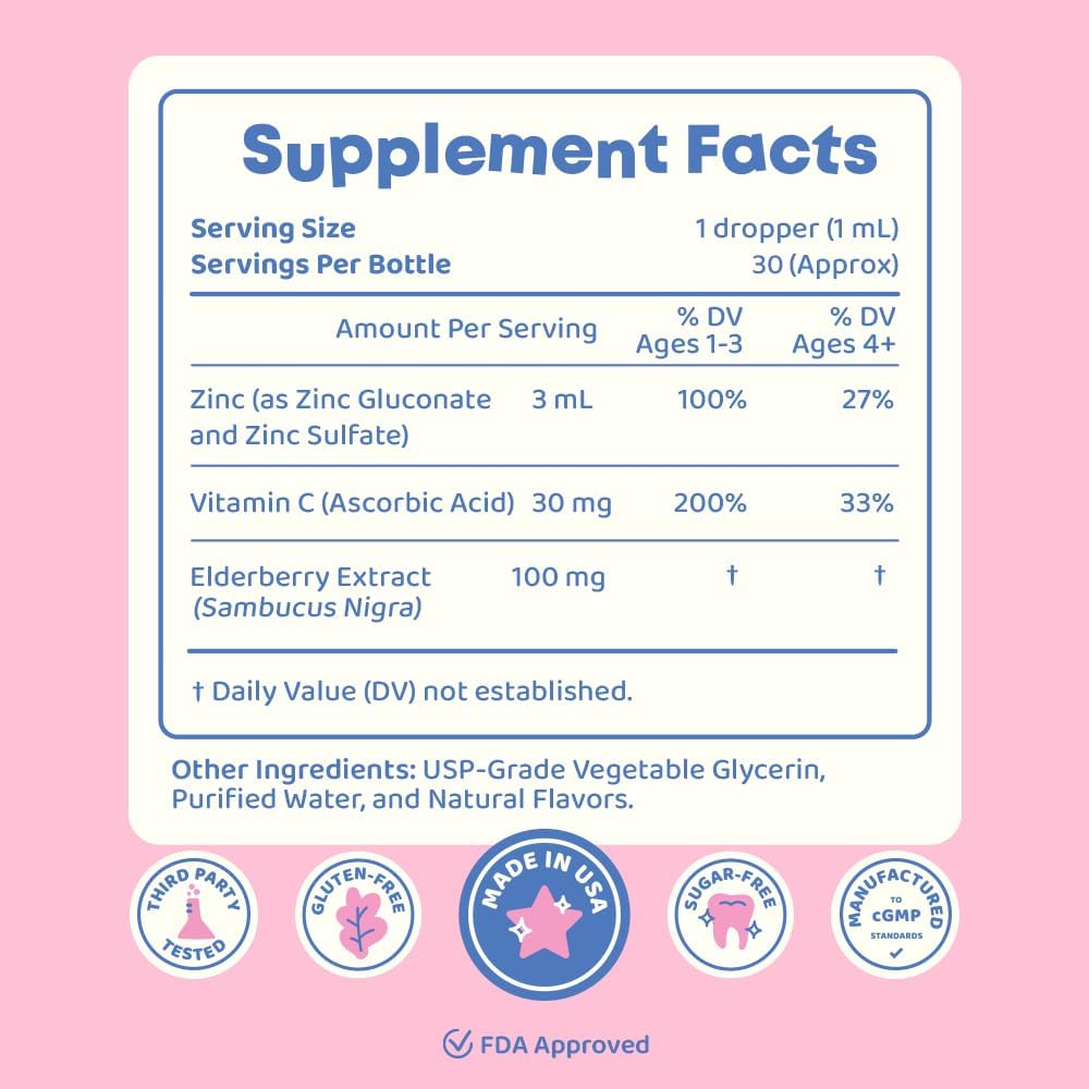 Kẽm, Chiết xuất Elderberry, Glycerin thực vật đạt chuẩn USP, Nước tinh khiết, Hương vị tự nhiên.