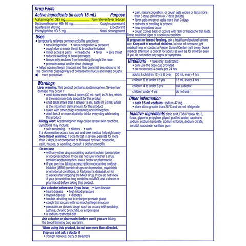 Thành phần: Acetaminophen 325 Mg, Dextromethorphan HBr 10 Mg, Guaifenesin 200 Mg, Phenylephrine HCl 5 Mg.