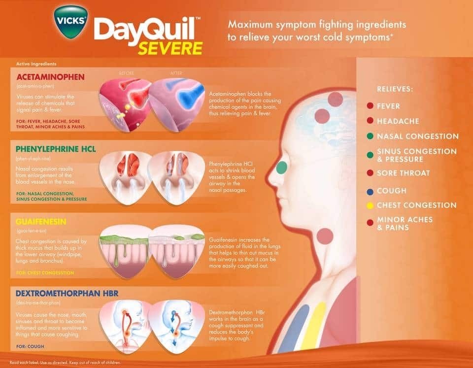 DayQuil SEVERE cung cấp các thành phần chống lại các triệu chứng cảm cúm, cảm lạnh tồi tệ nhất, khó chịu nhất vào ban ngày cũng như ban đêm. *