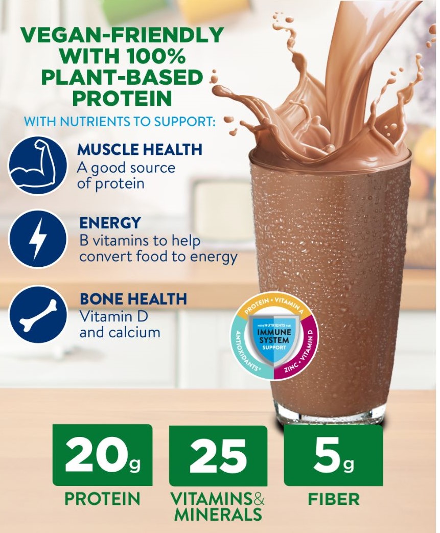 Ensure plant-based vegan protein chocolate nutrition shake có hương vị Socola thơm ngon và mang lại những lợi ích chính về dinh dưỡng đầy đủ và cân bằng cho sức khỏe hàng ngày. Sản phẩm tự hào có 5 gam chất xơ 25 loại vitamin và khoáng chất, và chỉ có 180 calo.