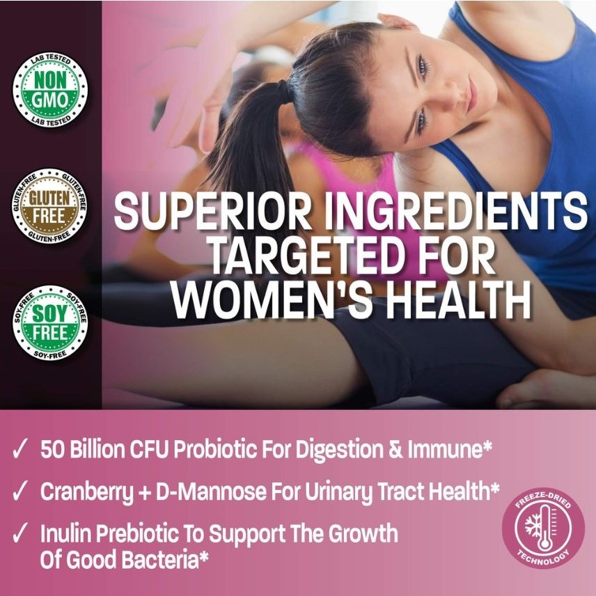 Prebiotic và probiotic dành cho phụ nữ đã được bên thứ 3 kiểm tra về độ tinh khiết và được sản xuất tại Hoa Kỳ bằng các thành phần nhập khẩu và trong nước. Sản phẩm được chứa trong viên nang chống axit để bảo vệ chống lại axit dạ dày với công nghệ giải phóng chậm để đảm bảo probiotic đến được ruột và giải phóng đến nơi cần thiết. Không cần bảo quản lạnh.