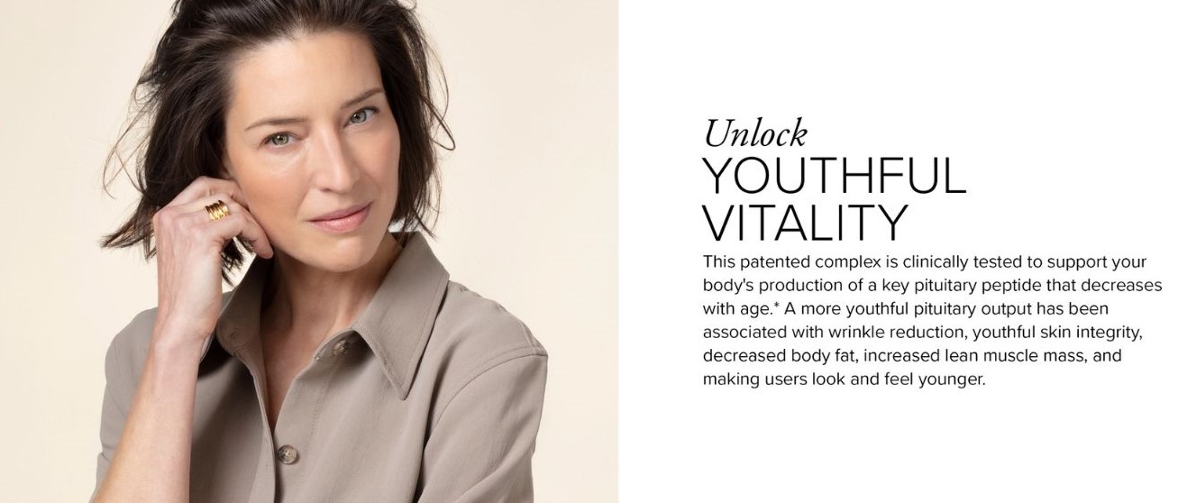 Phức hợp được cấp bằng sáng chế này đã được thử nghiệm lâm sàng để hỗ trợ cơ thể bạn sản xuất một loại peptide tuyến yên quan trọng, giảm dần theo tuổi tác. Sản lượng tuyến yên trẻ trung hơn có liên quan đến việc giảm nếp nhăn, tính toàn vẹn của làn da trẻ trung, giảm mỡ cơ thể, tăng khối lượng cơ nạc và giúp người dùng trông và cảm thấy trẻ hơn.