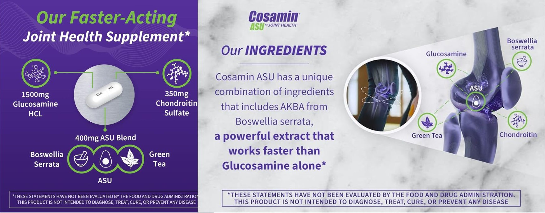 Thành phần: Glucosamine HCl, Natri Chondroitin Sulfate, Hỗn hợp ASU cô đặc độc quyền (Avocado/Soybean Unsaponifiables, Boswellia), Chiết xuất trà xanh không chứa caffein. Các thành phần khác: Gelatin. Chứa <2%: Silicon dioxide, chất tạo màu cho viên nang (titanium dioxide). Chứa: Đậu nành.
