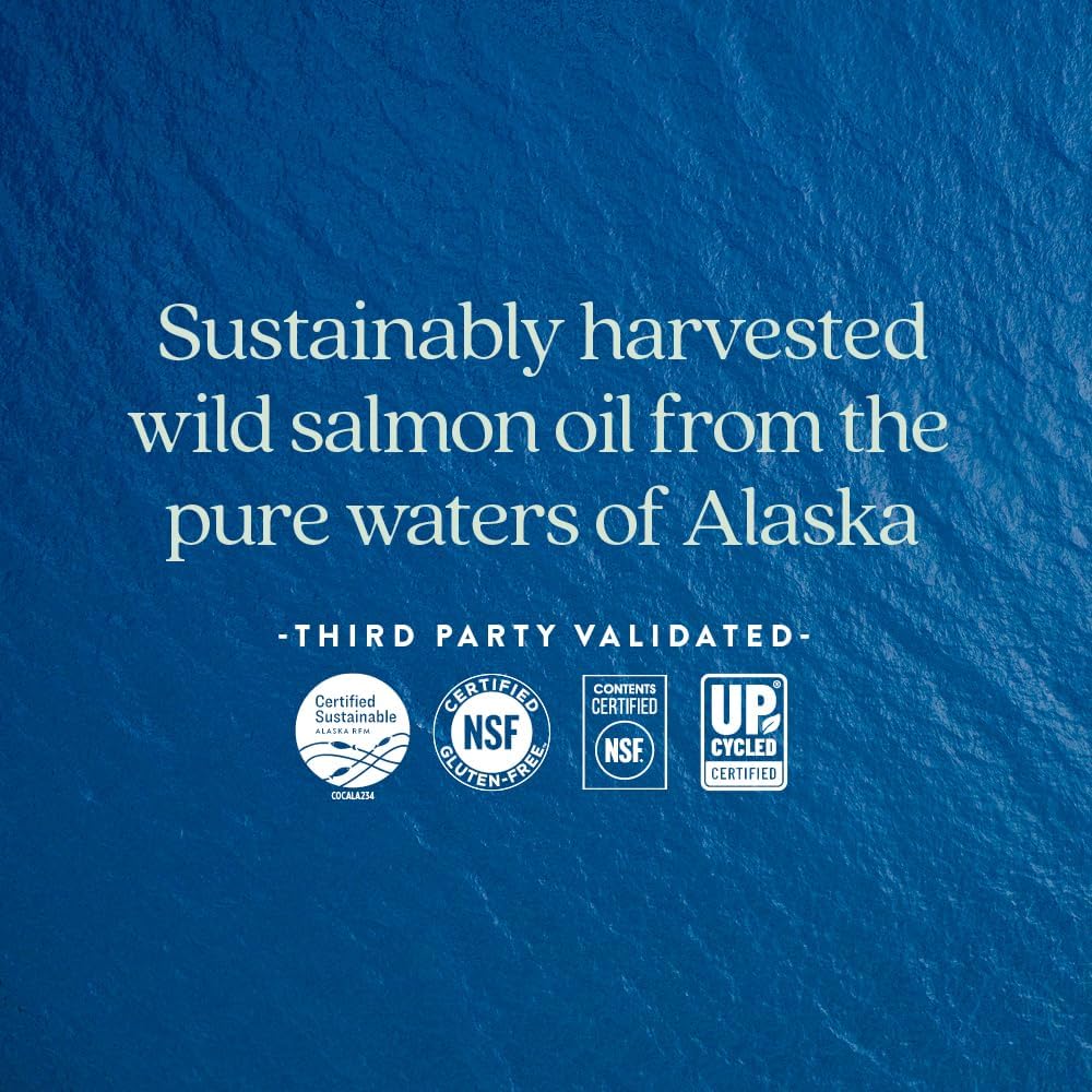 Dầu cá từ cá hồi hoang dã Alaska 100% dầu cá hồi Alaska đánh bắt tự nhiên, được kiểm soát nghiêm ngặt theo quy định của tiểu bang Alaska nhằm đảm bảo tính bền vững. Chứng nhận Upcycled Certified: tận dụng nguồn nguyên liệu từ phần cắt lọc cá hồi, giúp giảm lãng phí thực phẩm.