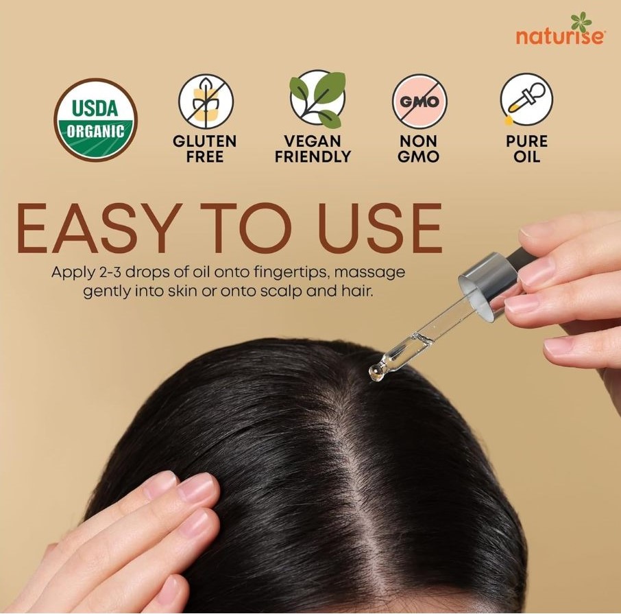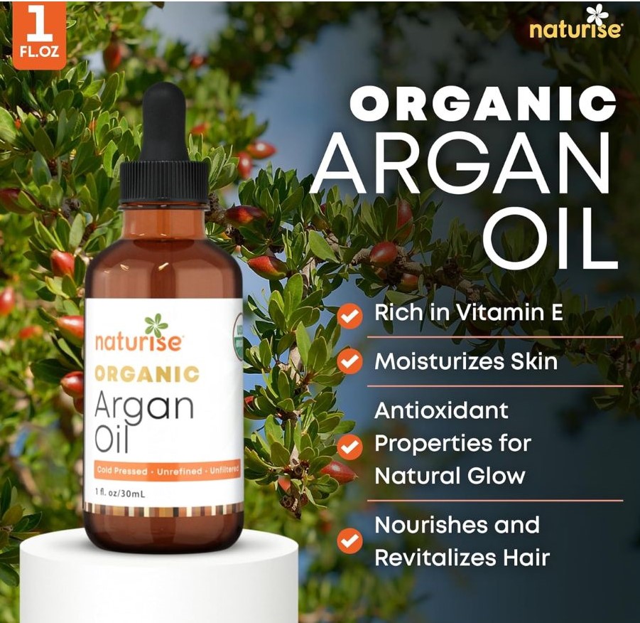 Organic Argan Oil for Hair Growth and Skin Moisture - Dầu Argan hữu cơ Naturise là kho báu của những lợi ích làm đẹp, được thu hoạch từ hạt cây Argan ở Morocco và ép lạnh để giữ nguyên thành phần dinh dưỡng phong phú. Khi thoa lên da hoặc tóc, cung cấp độ ẩm và phục hồi cho tóc mạnh mẽ, tăng cường vẻ đẹp tự nhiên của bạn mà không cần bất kỳ chất phụ gia nào.(A)