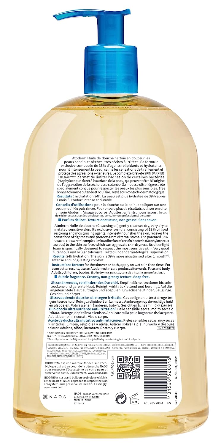 Face and Body Cleansing Oil for Very Dry Sensitive Skin - Dầu tẩy trang cho da mặt và cơ thể Bioderma mềm mượt nhẹ nhàng làm sạch da và cung cấp độ ẩm tức thì trong tối đa 24 giờ! Dầu tẩy trang nhẹ nhàng làm sạch da khô, rất khô đến da nhạy cảm dễ bị kích ứng. Công thức độc quyền của nó, bao gồm 33% chất phục hồi và giữ ẩm lipid, nuôi dưỡng mạnh mẽ làn da, làm giảm cảm giác căng và bảo vệ khỏi căng thẳng bên ngoài. Phức hợp trị liệu hàng rào bảo vệ da đã được cấp bằng sáng chế hạn chế sự bám dính của một số vi khuẩn (Staphylococcus aureus) lên bề mặt da, điều này có thể làm tình trạng khô da trở nên trầm trọng hơn. Bọt siêu nhẹ của dầu tẩy trang này được thiết kế đặc biệt để tôn trọng làn da nhạy cảm nhất, mức độ dung nạp cục bộ trên da và mắt rất tốt, thử nghiệm dưới sự giám sát da liễu. Sản phẩm phù hợp cho cả gia đình, có thể được sử dụng trên khuôn mặt và cơ thể. (A)