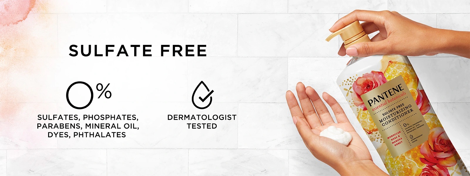 Pantene Essential Botanicals Moroccan Rose & Manuka Honey Conditioner - Có mái tóc ẩm mượt, thơm mát với dầu xả Pantene Essential Botanicals không chứa sulfat. Công thức giàu chất dinh dưỡng, nuôi dưỡng này, được chế tạo với hoa hồng Morocco và mật ong Manuka, giúp bạn có mái tóc mềm mại* và bóng mượt. Dầu gội không chứa sulfat nhẹ nhàng làm sạch và tăng cường sức mạnh cho tóc chống lại hư tổn, trong khi dầu xả giúp phục hồi độ ẩm tự nhiên của tóc.