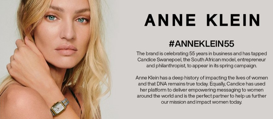 Anne Klein - Thương hiệu này đang kỷ niệm 55 năm kinh doanh và đã mời Candice Swanepoel, người mẫu, doanh nhân và nhà từ thiện người Nam Phi, xuất hiện trong chiến dịch mùa xuân của mình. Anne Klein có lịch sử sâu sắc về việc tác động đến cuộc sống của phụ nữ và DNA đó vẫn đúng cho đến ngày nay. Tương tự, Candice đã sử dụng nền tảng của mình để truyền tải thông điệp trao quyền cho phụ nữ trên toàn thế giới và là đối tác hoàn hảo để giúp Anne Klein tiếp tục sứ mệnh của mình và tác động đến phụ nữ ngày nay.