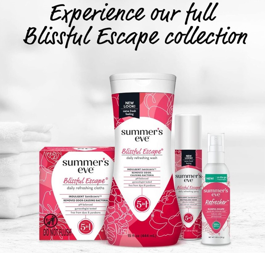 Dung dịch vệ sinh phụ nữ Summer's Eve Blissful Escape đầy mê hoặc được lấy cảm hứng từ trái cây, hoa và quả mọng rực rỡ và đủ làm mới cho làn da mỏng manh nhất của bạn. Đó là lý do tại sao hàng triệu phụ nữ tin tưởng vào dòng sản phẩm chăm sóc và làm sạch đã được bác sĩ phụ khoa kiểm nghiệm của Summer's Eve. Các sản phẩm đa dạng của Summer's Eve được sản xuất dành cho tất cả mọi người - dù bạn đang ở nhà hay đang di chuyển, muốn đắm mình trong hương thơm ngọt ngào hoặc không có mùi hương nào hoặc muốn cảm giác sảng khoái cực độ.