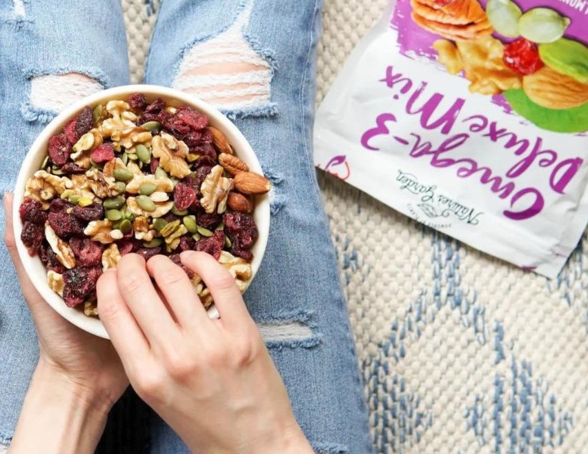 Hỗn hợp omega 3 này là một món ăn nhẹ giàu chất xơ, giàu protein, lý tưởng để giúp bạn trong chế độ giảm cân hoặc tập luyện để thỏa mãn cơn đói lâu hơn. Hạnh nhân và quả óc chó cung cấp một loạt axit béo omega-3 có lợi cho tim, rất quan trọng trong việc duy trì một trái tim khỏe mạnh. Chưa kể đến lợi ích chống oxy hóa do hạt bí ngô và quả nam việt quất mang lại, được biết là giúp bảo vệ cơ thể bạn khỏi bệnh tật.