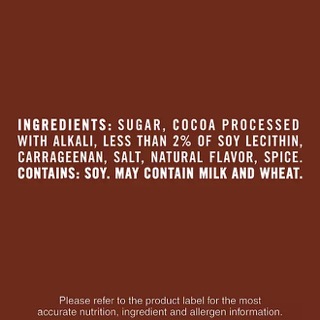 Thành phần: đường, ca cao chế biến bằng kiềm, lecithin đậu nành dưới 2%, carrageenan, muối, hương liệu tự nhiên, gia vị.