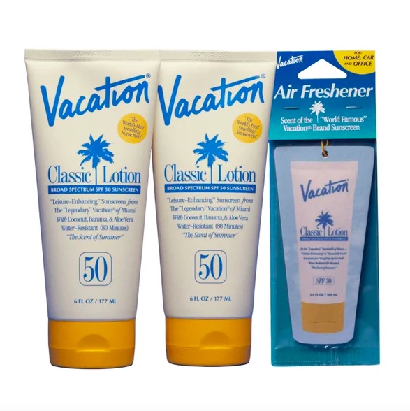Gói bao gồm 2x 6oz Classic Lotion SPF 50 cộng với một bình xịt phòng Vacation® có mùi hương của "Kem chống nắng có mùi thơm nhất thế giới"