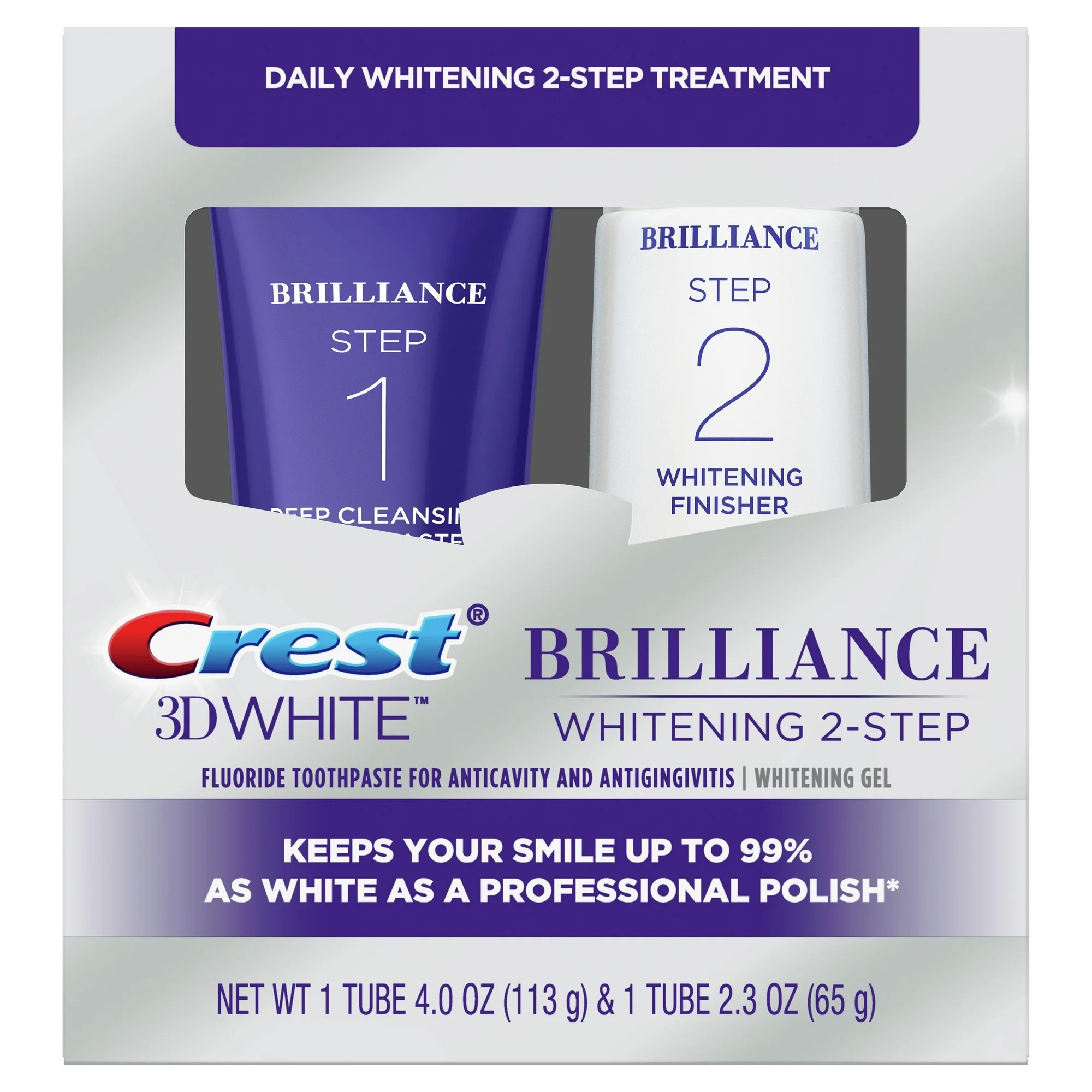 Crest 3D White Brilliance + Whitening Two-Step Toothpaste - Nâng cấp Quy trình Chăm sóc Răng miệng của bạn. Cảm nhận sự khác biệt của hệ thống 2 bước mà bạn có thể sử dụng hàng ngày. 2 phút, hai lần mỗi ngày cho Nụ cười Trắng hơn. Trải nghiệm kết quả làm trắng tuyệt vời với kem đánh răng làm sạch hàng ngày Crest 3D White Brilliance và hệ thống gel làm trắng. Hệ thống hai bước bao gồm kem đánh răng làm sạch sâu và chất làm trắng hoàn thiện. Bước 1 làm sạch kỹ lưỡng và Bước 2 đánh bóng và làm trắng để giữ cho nụ cười của bạn trắng sáng đến 99% như đánh bóng chuyên nghiệp*. Bạn có thể cảm nhận sự khác biệt chỉ sau một lần sử dụng. *khi sử dụng hàng ngày. Đánh giá vết ố 4 tuần sau khi vệ sinh răng miệng.(W)