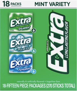 EXTRA Mint Sugar Free Chewing Gum - Hộp kẹo cao su EXTRA Bulk Variety của chúng tôi là món quà không bao giờ lỗi mốt. Hãy cùng nhau tận hưởng những kết nối ý nghĩa trong cuộc sống với 18 gói kẹo cao su không đường thơm ngon. Mỗi hộp kẹo cao su bao gồm ba hương vị sảng khoái: EXTRA Polar Ice, EXTRA Spearmint và EXTRA Peppermint.(S)