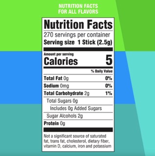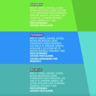 Thành phần Polar Ice: Sorbitol, nền gôm, Glycerol, hương liệu tự nhiên và nhân tạo, Thủy phân tinh bột hydro hóa; Ít hơn 2%: Aspartame, Mannitol, Lecithin đậu nành, Acesulfame K, BHT (Để duy trì độ tươi), Màu (Blue 1 Lake).