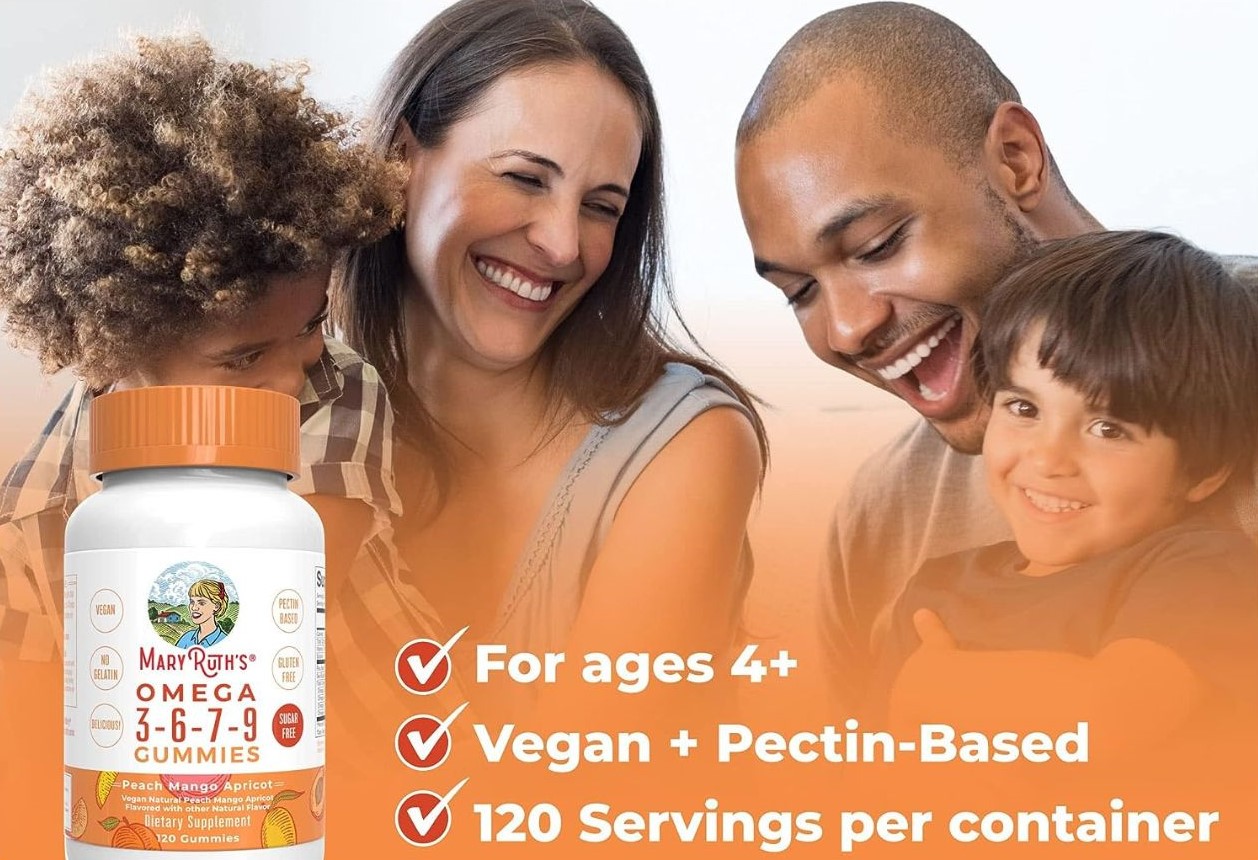 Vegan Omega 3-6-7-9 Gummies by MaryRuth's - Kẹo dẻo bổ sung omega 3-6-7-9 của MaryRuth Organics được làm từ axit béo omega hữu cơ, không biến đổi gen, thuần chay, có nguồn gốc từ dầu hạt lanh hữu cơ và seaberry hữu cơ. Kẹo dẻo bổ sung này cung cấp năng lượng cho cơ thể, đồng thời hỗ trợ sức khỏe tim mạch và chức năng trao đổi chất lành mạnh. Hãy thưởng thức những viên kẹo dẻo có hương vị đào - xoài - mơ thơm ngon này và cung cấp một phức hợp axit béo omega tuyệt vời!