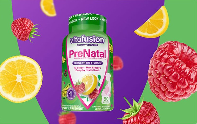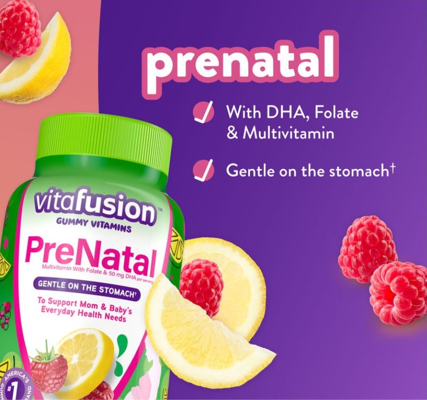 Kẹo dẻo vitamin tổng hợp Vitafusion giúp hỗ trợ nhu cầu sức khỏe hàng ngày của mẹ và bé với 100% giá trị folate hàng ngày và nguồn vitamin A, vitamin C và vitamin D, cung cấp biotin, iodine, kẽm và vitamin E, B3, B6 và B-12, cùng với 50 mg omega-3 DHA, một chất dinh dưỡng quan trọng cho sức khỏe thai kỳ. Sản phẩm được sản xuất không có hương vị nhân tạo hoặc chất làm ngọt, gluten, xi-rô ngô có hàm lượng fructose cao, sữa hoặc thuốc nhuộm tổng hợp.