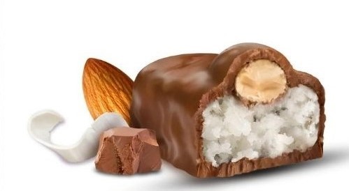 Siro ngô, đường, dừa, dầu thực vật (dầu cọ, dầu hạt mỡ, dầu hướng dương, dầu hạt cọ và/hoặc dầu cây rum), hạnh nhân, sô cô la, sữa tách kem: lactose (sữa), ca cao, váng sữa (sữa), muối, lecithin (đậu nành), mỡ sữa, bơ ca cao...