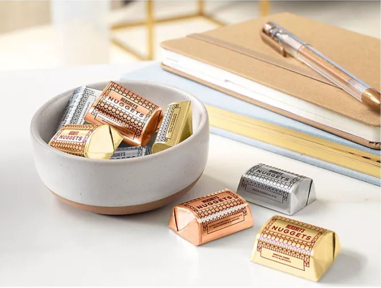 Bạn có thể trang trí bàn bếp bằng một bát kẹo Hershey's Nuggets, hoặc chia sẻ món kẹo này với những người đồng nghiệp hoặc mang món kẹo này làm quà dự tiệc bất cứ lúc nào. Kẹo sô cô la Hershey's Nuggets đủ loại là một món ăn làm hài lòng đám đông trong các đêm trò chơi hoặc các cuộc thi kéo dài. Những sô cô la này là hoàn hảo cho bất kỳ lễ kỷ niệm theo mùa nào, chúng sẽ là món quà hoàn hảo vào ngày lễ hội Giáng sinh, lấp đầy giỏ Phục sinh, quà Ngày lễ tình nhân hoặc cho đêm hội Halloween. Bất kể bạn thấy mình ở đâu và ai sẽ ở đó với bạn, hãy giữ một ít kẹo sô cô la xung quanh để làm sôi động các bữa tiệc, cuộc họp công việc hoặc trong các cuộc họp mặt gia đình.