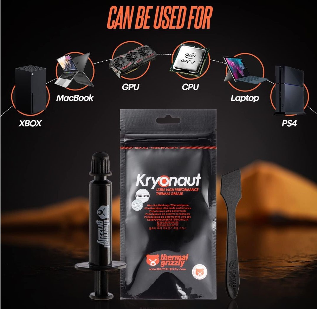 Nó có thể hoạt động với hầu hết mọi hệ thống có không khí hoặc nitơ lỏng (xuống đến -250 °C). Thermal Grizzly Kryonaut là keo tản nhiệt được khuyến nghị cho các ứng dụng CPU yêu cầu độ dẫn nhiệt cao ở nhiệt độ phòng – ví dụ giữa bộ vi xử lý PC chip silicon và bộ tản nhiệt. Nó đi kèm với một dụng cụ rải keo tản nhiệt.