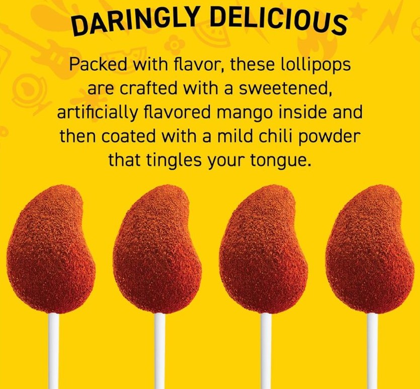 Vero Mango Lollipops Coated with Chili Powder - Thêm gia vị cho cuộc sống của bạn với món ăn mang đến vị cay khó cưỡng trước khi mang đến hương vị ngọt ngào sảng khoái của xoài! Chỉ với kẹo Vero, bạn mới có thể khám phá ra món ăn mang đậm hương vị văn hóa Tây Ban Nha trong từng miếng ăn. Vero Mango và Chili Lollipops được phủ bột ớt để tạo vị thơm, hơi nóng và được làm bằng xoài ngọt, có hương vị nhân tạo chắc chắn sẽ làm hài lòng vị giác của bất kỳ ai.(A)