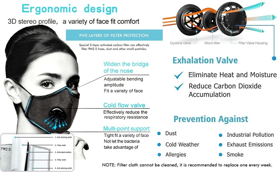 LỌC ĐÔI: Mặt nạ này có Bộ lọc PM2.5 và van thở, có thể cho phép không khí đi vào cơ thể trong khi vẫn giữ ẩm. Nó cũng giúp bạn tránh xa các chất độc và chất có hại trong không khí.