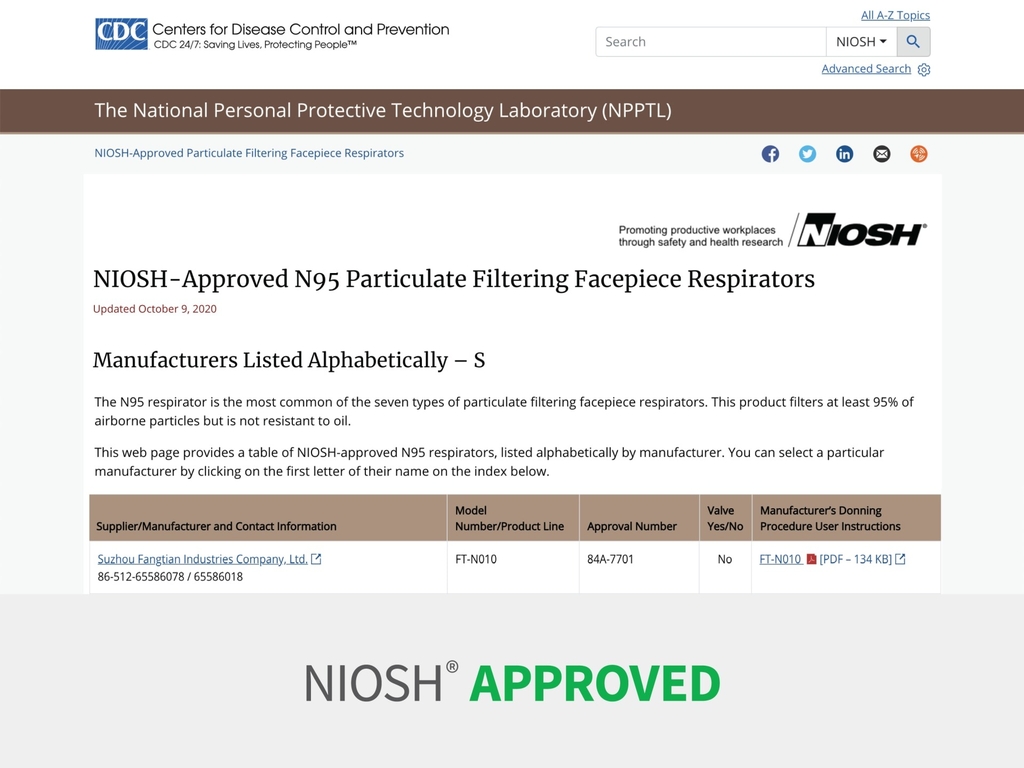Khẩu trang hạt N95 được NIOSH phê duyệt này được phép sử dụng cho mục đích y tế theo giấy phép sử dụng khẩn cấp do FDA cấp vào ngày 2 tháng 3 năm 2020 (cập nhật ngày 28 tháng 3 năm 2020).